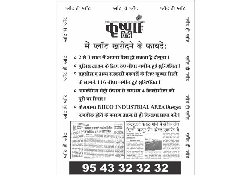 Krishna City (A Luxurious Living Life Style..) is a GATED Township Spread in 50 Bighas, Adjoining to Keshwana Industrial Area. It is a Small initiative from SKY GROUP to give a better opportunity for your Living Style. Sky Real Group Launch their Dream Project on the Concept of “Day ONE Possession & Registry”. Good source of Rental Income can be expected as more than 20,000 Employees are already working in Keshwana RIICO Area. Neemrana-Behror-Kotputli will have the Cyber City, Medicity, Knowledge City, Entertainment City, SEZ City, World Trade City, Bio-diversity park, with Their respective commercial areas.